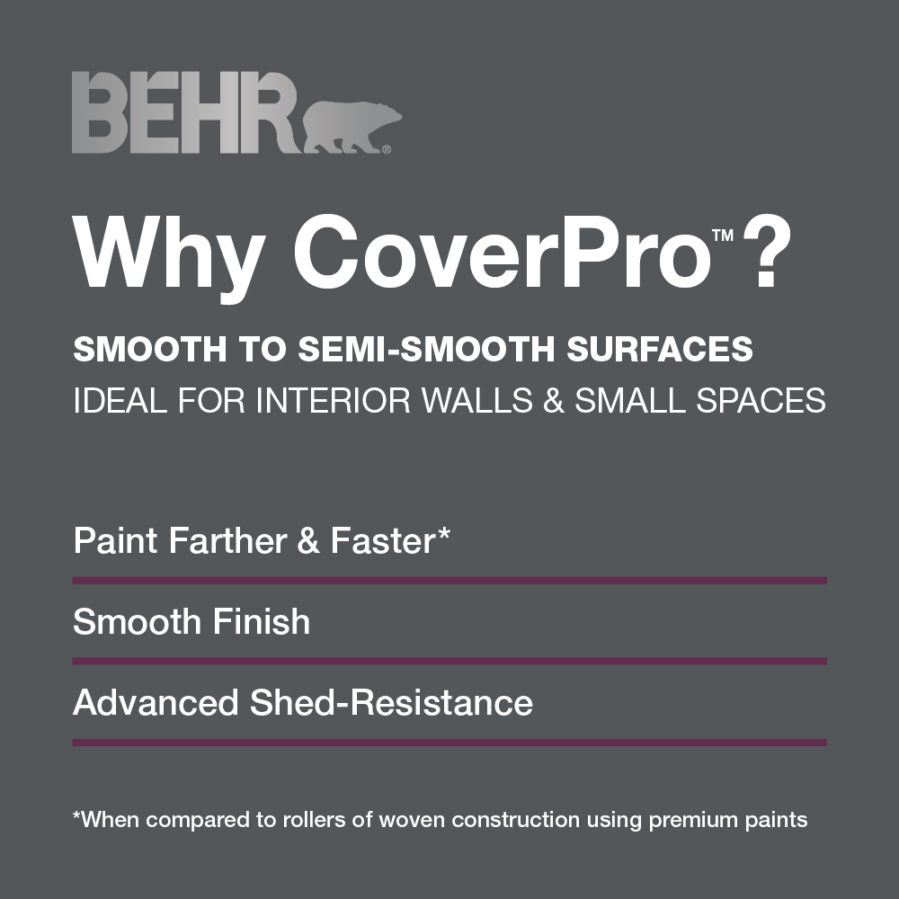 Achieve efficient, high-quality painting with BEHR CoverPro™ roller fabric. This high-performance fabric enables you to paint farther and faster* while delivering a remarkably smooth finish with advanced shed-resistance. The 10mm (3/8 in.) nap is ideal for smooth to semi-smooth surfaces, while the 10cm (4 in.) length makes it perfect for interior walls and small spaces.