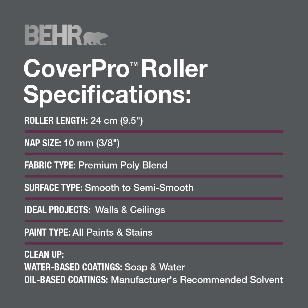 Achieve efficient, high-quality painting with BEHR CoverPro™ roller fabric. This high-performance fabric enables you to paint farther and faster* while delivering a remarkably smooth finish with advanced shed-resistance. The 10mm (3/8 in.) nap is ideal for smooth to semi-smooth surfaces, while the 24 cm (9.5 in.) length makes it perfect for interior walls and ceilings.