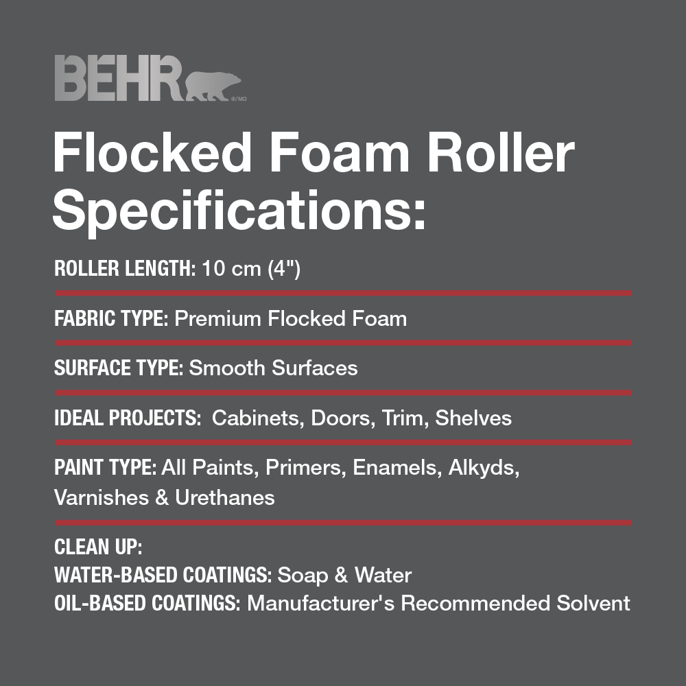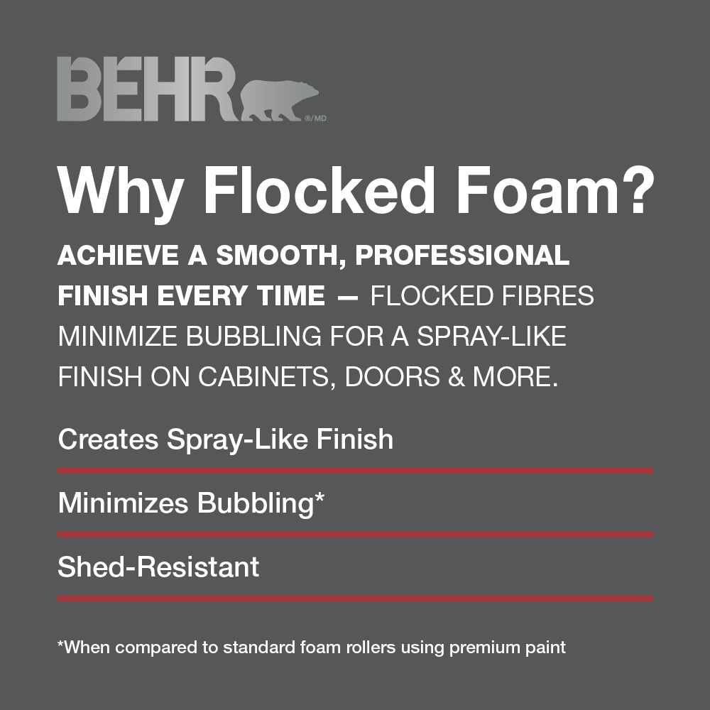 Experience a smooth, professional finish with BEHR Premium Flocked Foam rollers, perfect for cabinets, doors, and trim. They deliver a spray-like result, with flocked fibres that minimize bubbling* for a smooth and even finish. Plus, they cover more area than traditional high-density foam rollers, helping you to complete your project faster.