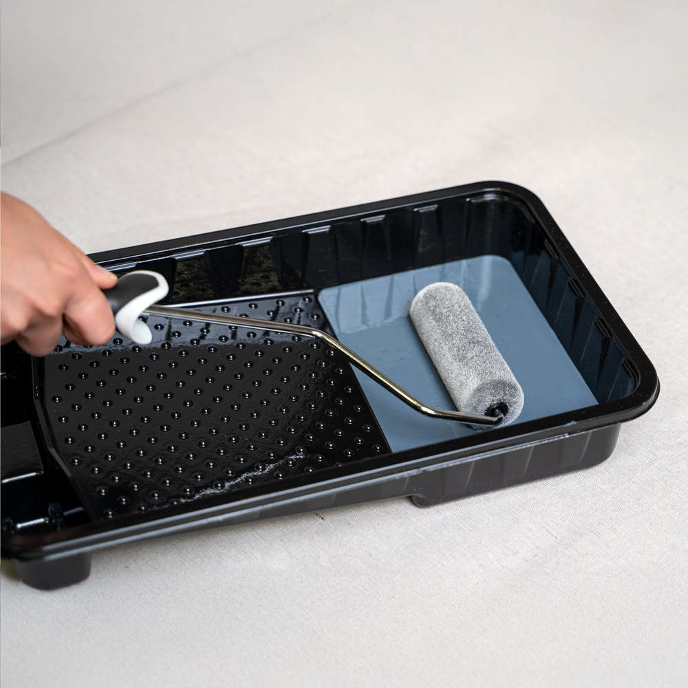 • Dip the roller into the paint-filled tray or bucket, then roll it over the ribbed section of the tray or grid to remove excess paint and prevent dripping.